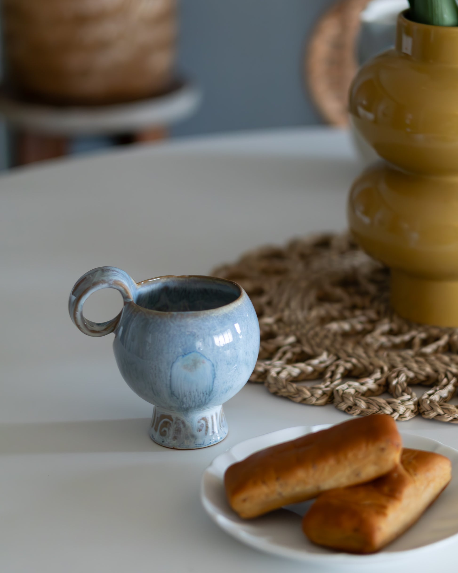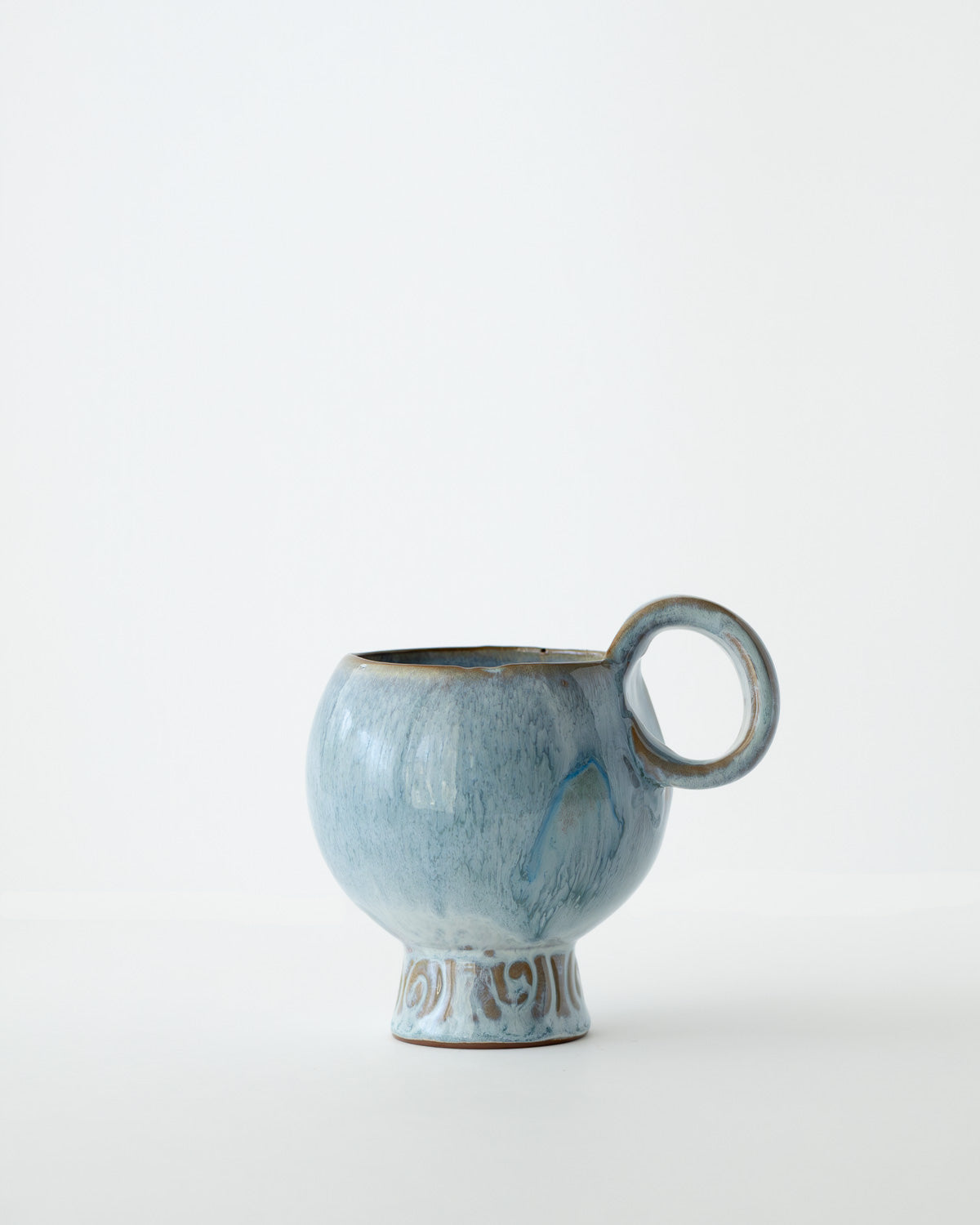 Bloomingvilleのアヴォンリーカップは、反応性釉を施された青みがかったストーンウェア製です。カップには高台と丸い取っ手が付いています。釉薬の性質上、色にばらつきがあり、カップ一つ一つが唯一無二の個性を放ちます。