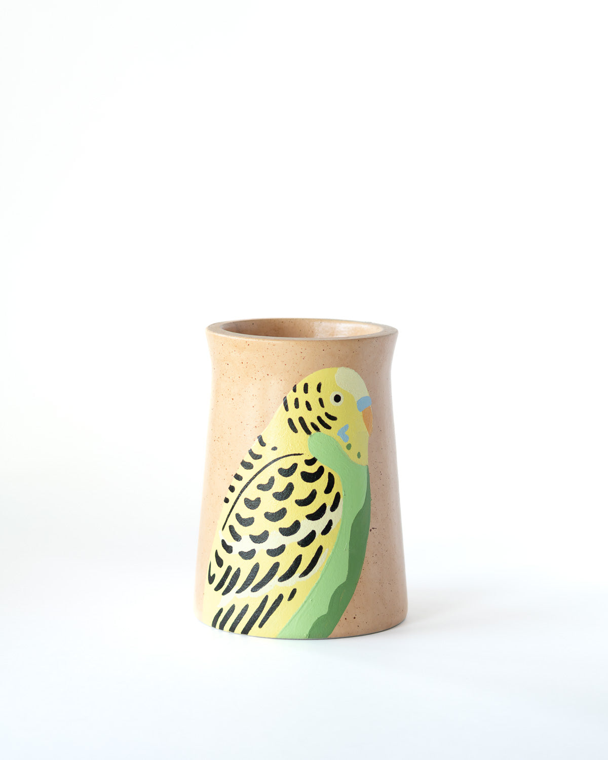 オーストラリアで親しまれているセキセイインコ(Budgie)をモチーフにした、手描きのテラコッタベース。