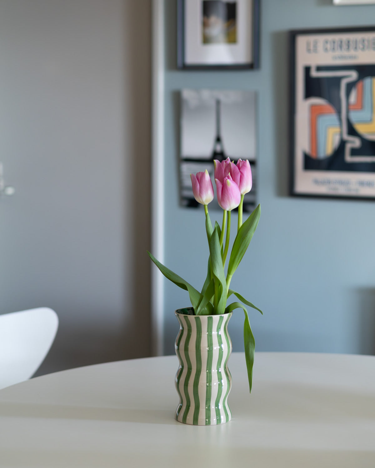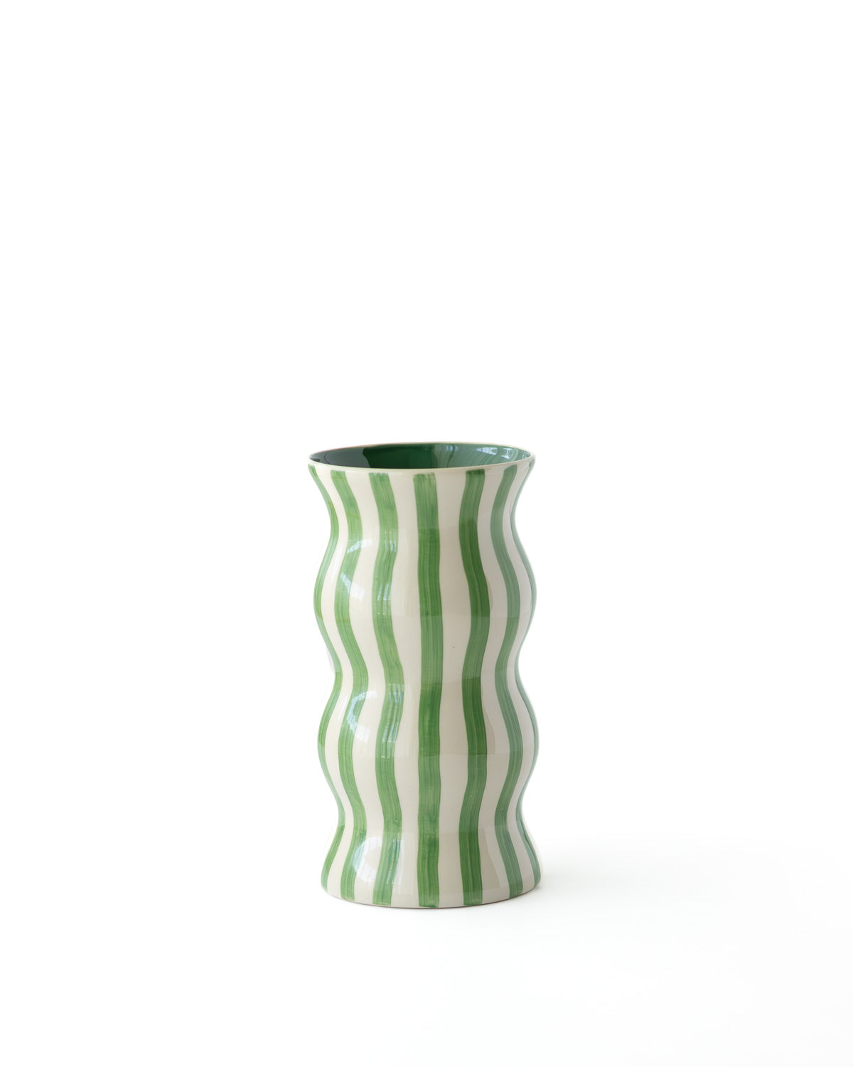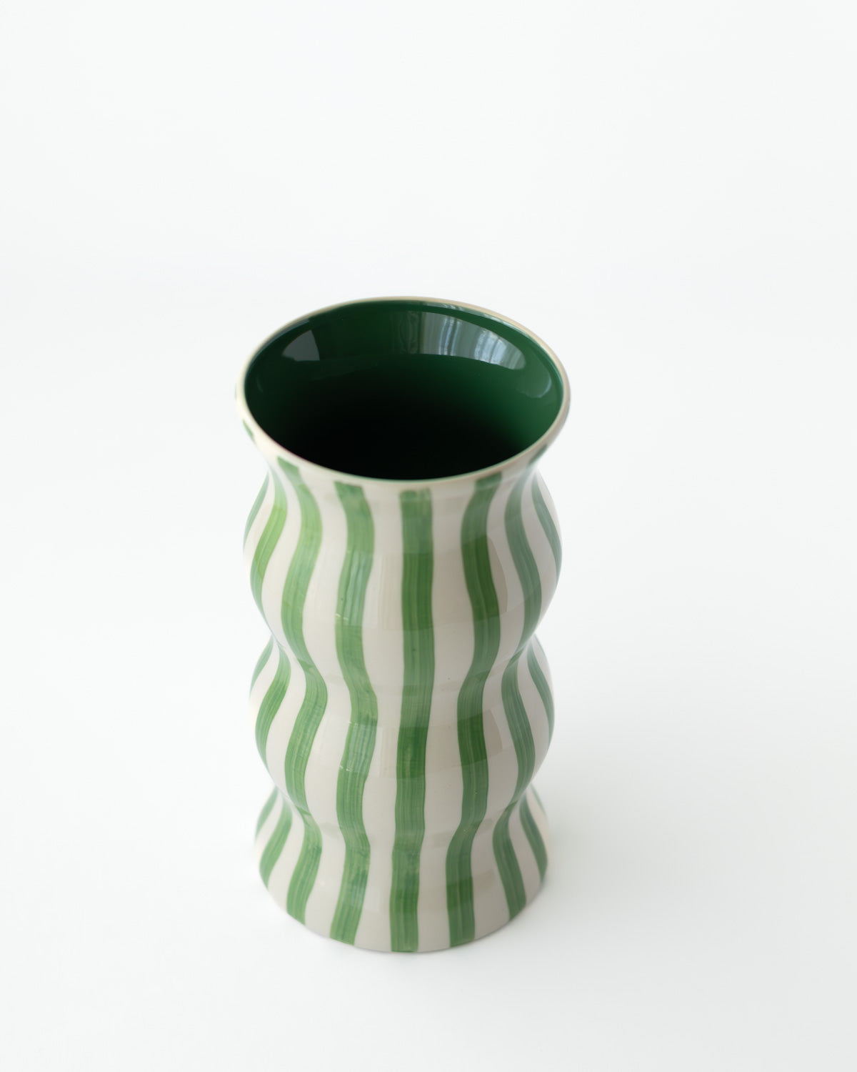 鮮やかなグリーンとやわらかなホワイトのストライプが映える、Jones&COのフラワーベースPalma。